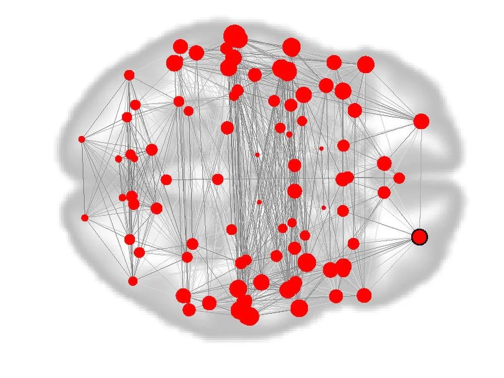 这张大脑“指纹”的功能连接图,展示了12岁儿童的不同脑区是如何相互作用的。该图是通过静息状态核磁共振成像绘制的。较大的红色圆圈表示具有较多连接的脑"节点"。