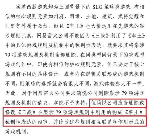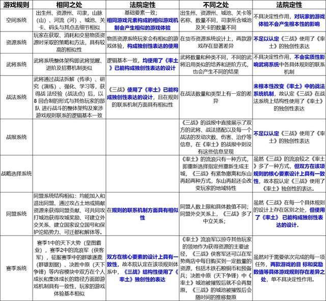 在一审诉讼过程中,网易共主张了《率土之滨》有121项游戏规则具有独创性,去重后剩106项,最终法院支持79项规则属于独创性的游戏规则,共涵盖了空间系统、资源系统、武将系统、战法系统、同盟系统、赛季系统等方方面面,以及各系统耦合关系。
