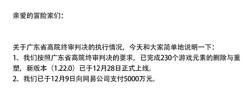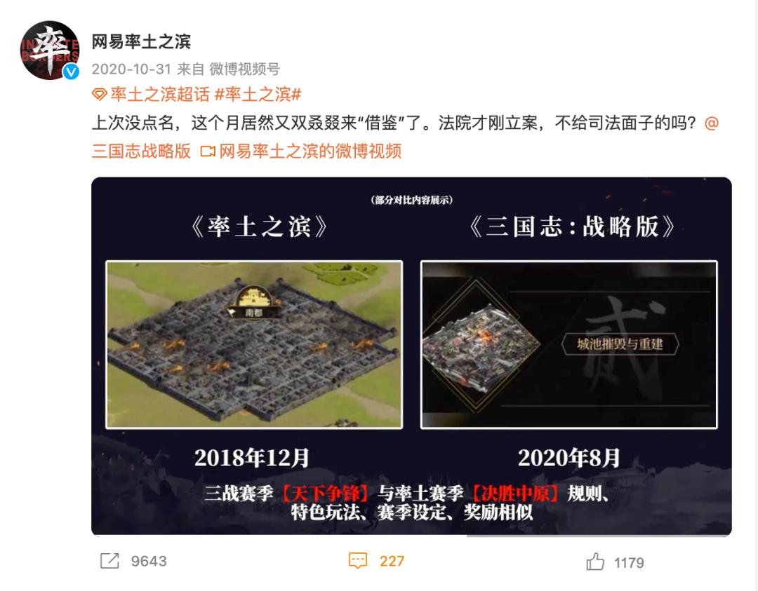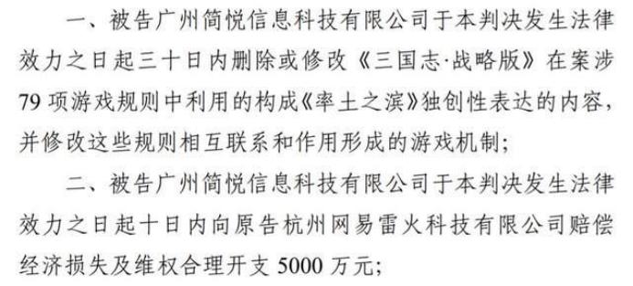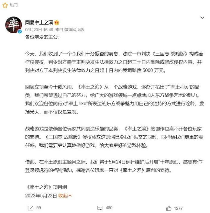 5月23日,网易旗下策略游戏《率土之滨》发布微博称,“广州互联网法院一审判决《三国志·战略版》构成著作权侵权,判令对方需要于判决生效之日起30天内删除或修改侵权内容,并赔偿网易5000万元。”