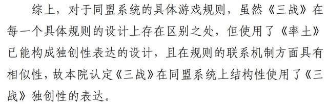 法院在判决书中写道:“《率土之滨》游戏通过规则间的相互联系以及由此形成的各种游戏机制的相互耦合,形成了庞大的游戏系统,形成稳定的具有独创性的游戏机制,应当被认定为‘符合作品特征的其他智力成果’,游戏整体纳入符合作品特征的其他智力成果予以保护的主张,本院予以支持。”