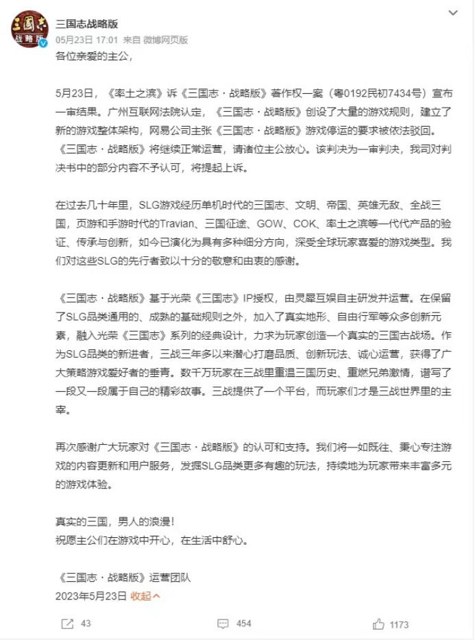 不过,对于《率土之滨》方面的说法,灵犀互娱旗下的《三国志·战略版》在15分钟内便予以了反驳,大致意思是,“游戏将正常运营,对于一审判决的部分内容不认可,将提起上诉。”