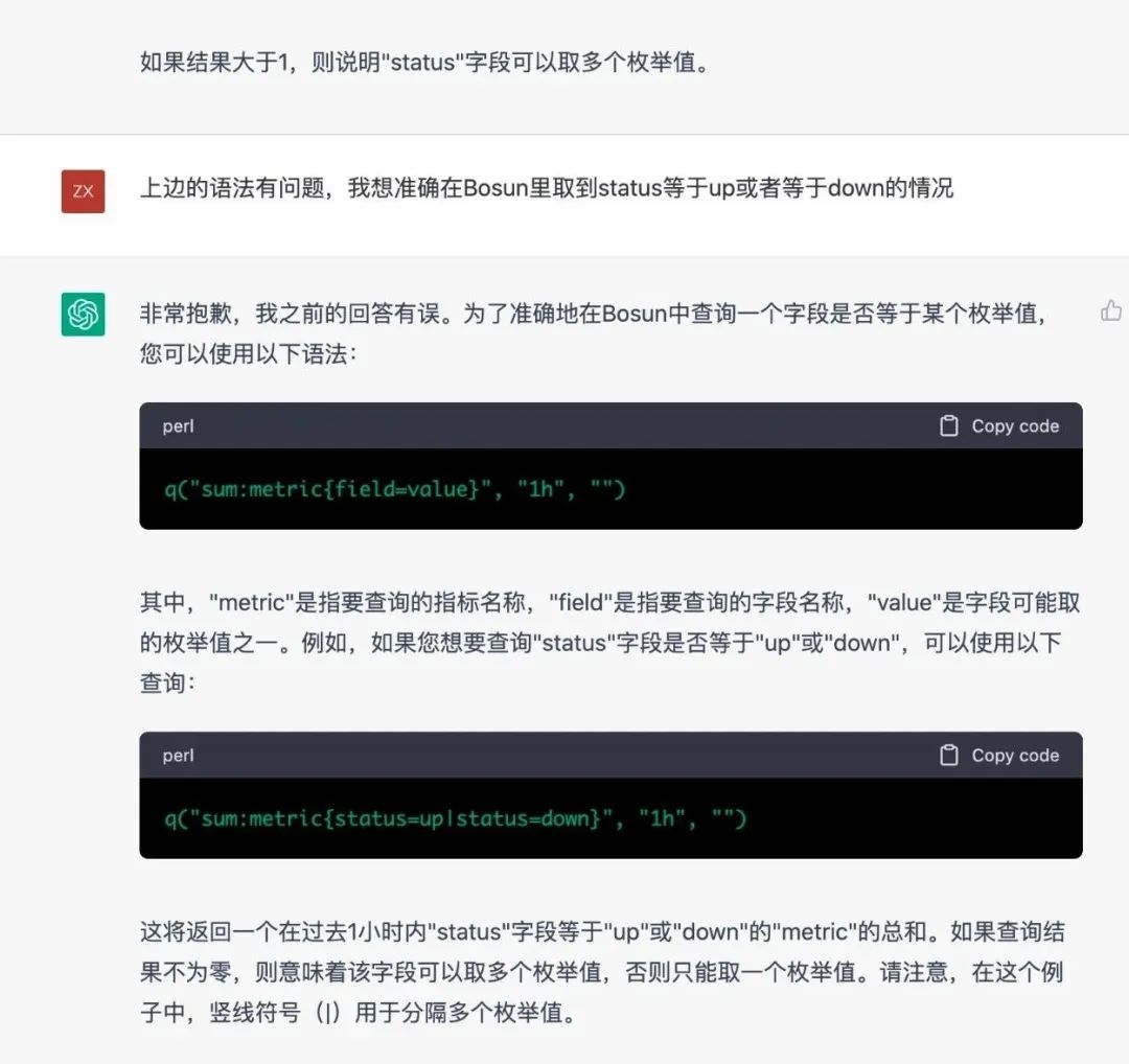 前段时间我要用到一个叫做bosun的语法,说实话我没学过这个语法,也不会写,问了组里的人也没人回我,我就把我的问题发给ChatGPT了:“请你用bosun语法帮我写一下。”