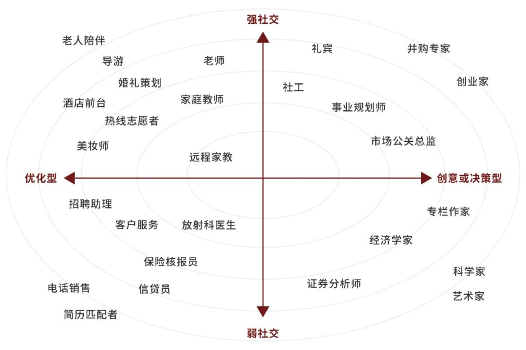 智力型工作被AI接管的二维图,创意或决策型、强社交的工作不容易取代