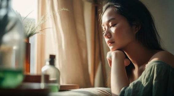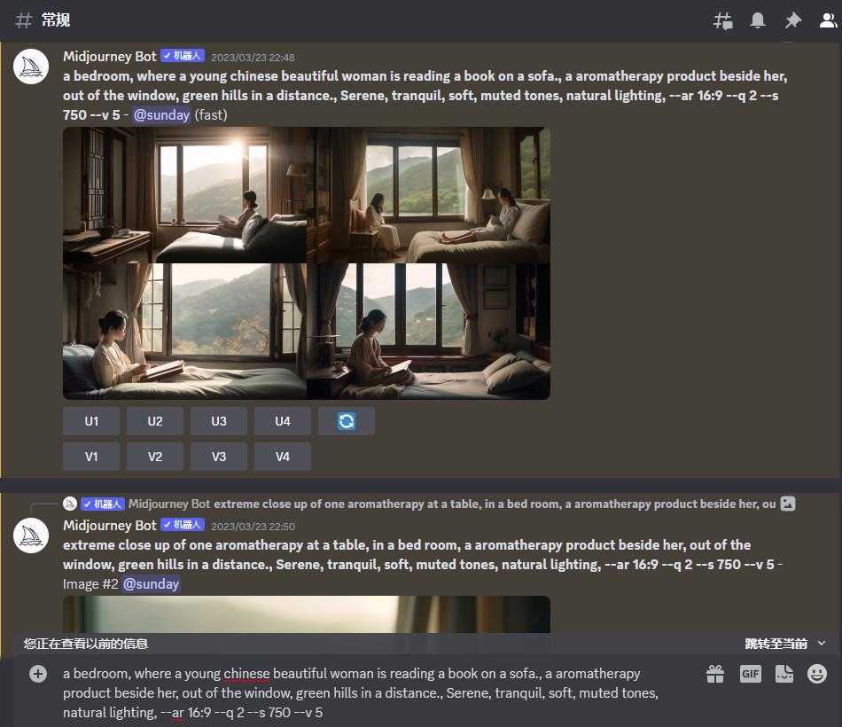 比如前阵子我做的香薰广告的案例,故事发生在大山脚下的一个房间里,女主角是个漂亮的女孩子,我就会输入:一位美丽的女孩坐在窗边,旁边的茶几上摆着我们的香薰产品,早上的气氛,柔和的光,窗外远方是群山,写实风格,ue5引擎,8k分辨率,- - ar 16:9, - - v5,然后点击生成。