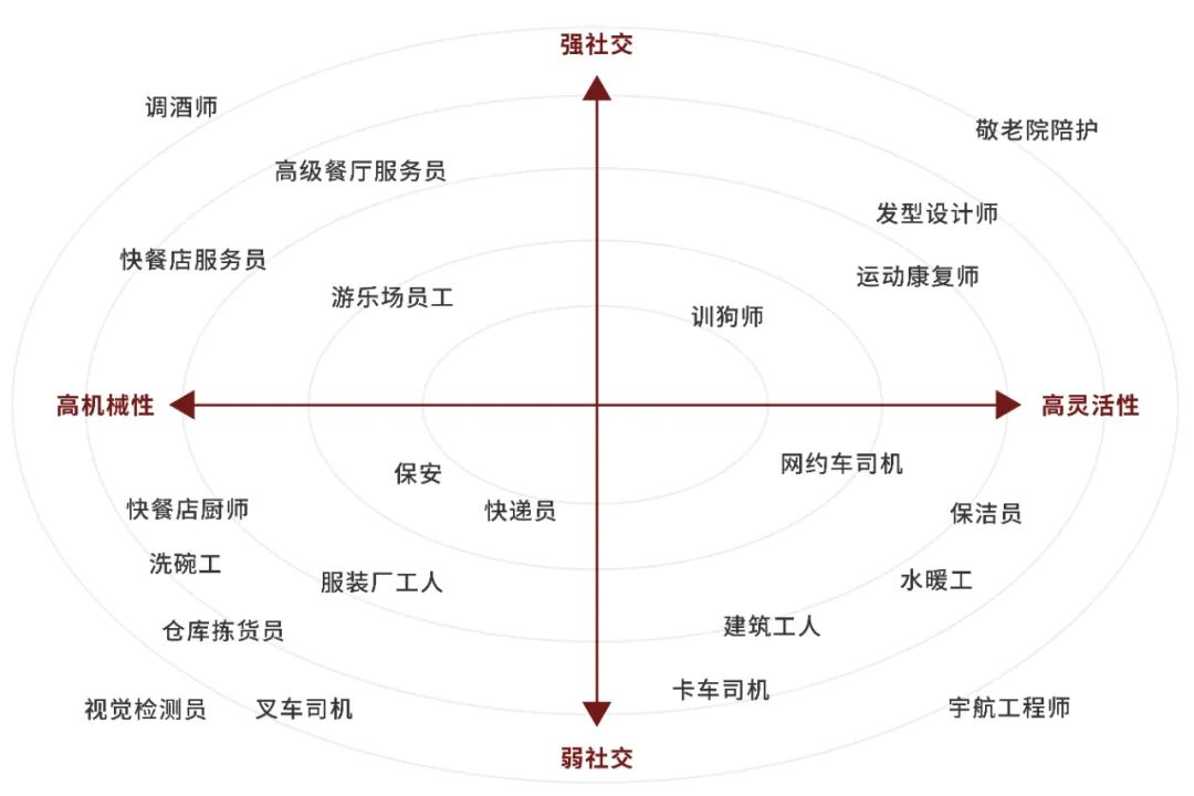 劳力型工作被AI接管的二维图,强社交、高灵活性的工作不容易被AI取代
