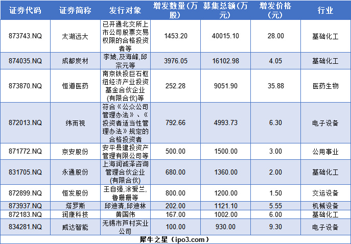 其中太湖远大(873743)拟募资4亿元,增发价格28元/股,公司专业从事环保型线缆用高分子材料的研发、生产和销售。2022年营收为13.92亿元,归母净利润为6116.71万元。