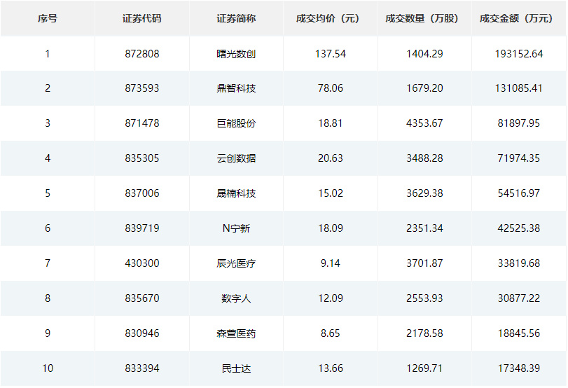 成交方面,本周北交所共成交7.35亿股,环比上周增长22.61%;成交金额为108.06亿元,环比上周增长17.34%。个股方面,成交额前三名分别是曙光数创(872808)、鼎智科技(873593)、巨能股份(871478),分别成交19.31亿元、13.1亿元和8.18亿元,3只个股周换手率分别为51.35%、93.47%、219.89%。整体来看,北交所197家公司平均周换手率为10.07%。