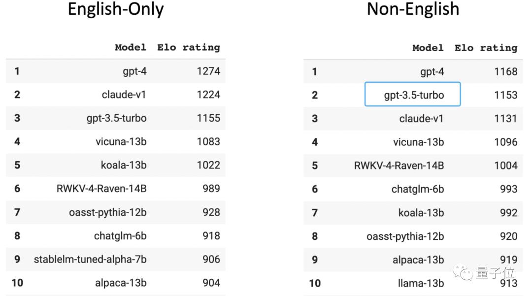 在人类玩家打分的大模型匿名竞技场Chatbot Arena榜单中,GPT-3.5在非英文排行榜位居第二(第一是GPT-4)。要知道,96%的GPT-3.5训练数据都是英文,再刨去其他语种,用来训练的中文数据量少到可以用“千分之n”来计算。