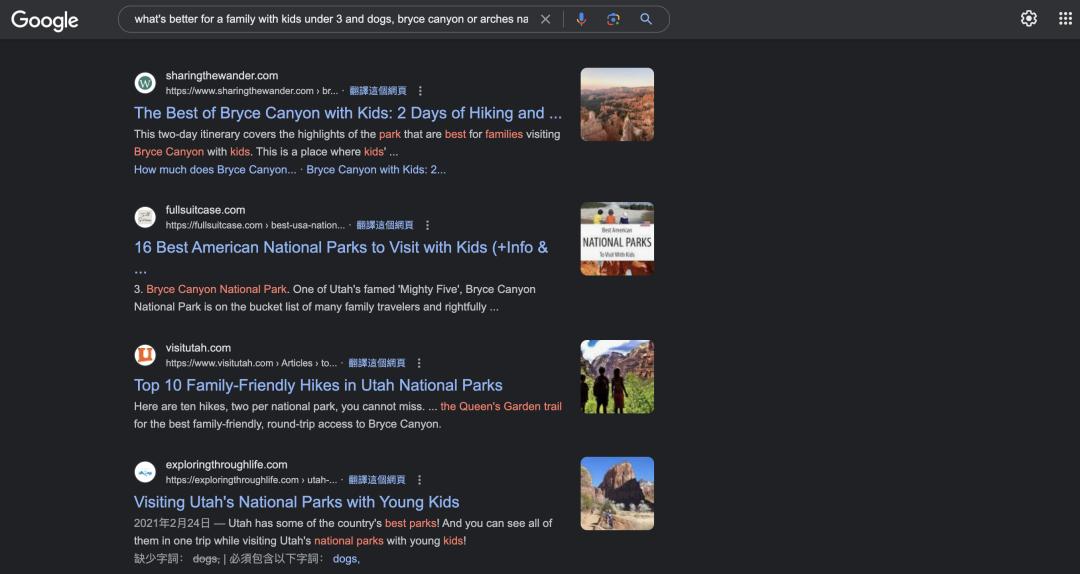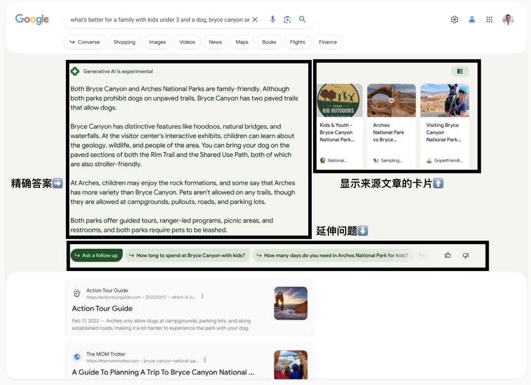 举一个更具体的例子,有网友用 SGE 提问“布莱斯峡谷国家公园和拱门国家公园,哪一个更适合有三岁以下儿童和宠物狗狗的家庭游玩”。
