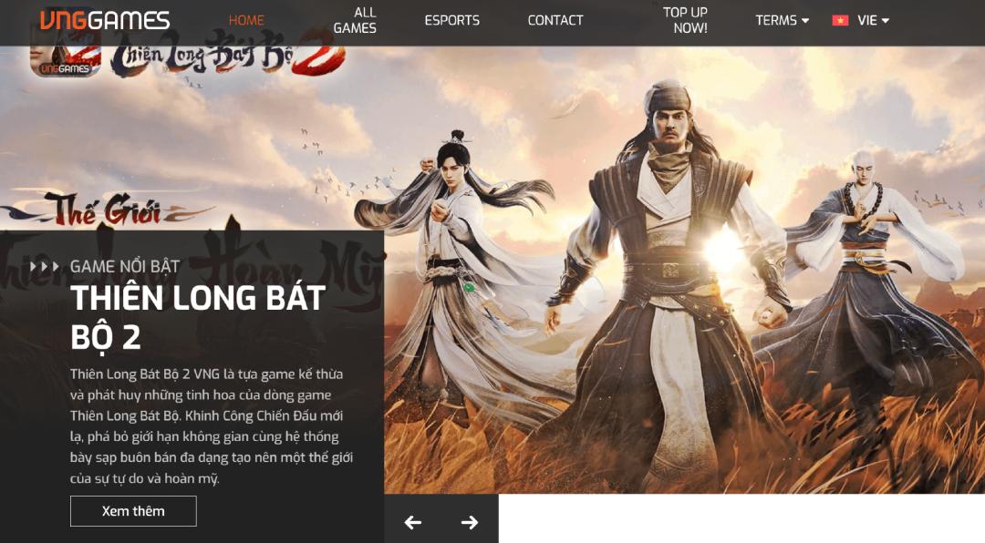 打开越南头部游戏发行公司VNG的网站,映入眼帘的便是金庸正版授权的3D真武侠MMORPG手游《天龙八部2》。这款游戏由完美世界参股公司阅龙智娱研发,VNG代理发行,在2022年11月时,国服还没上线,《天龙八部2》就已经在越南开启了公测。