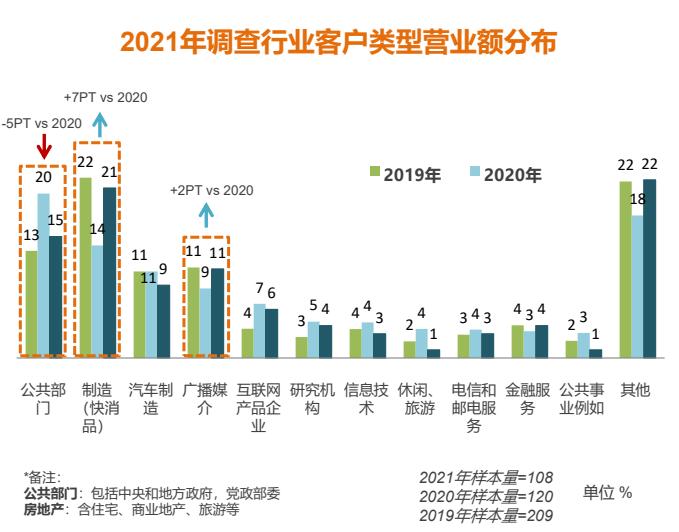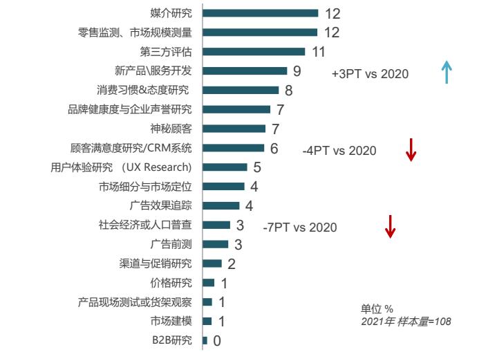 基于CMRA的数据,数据洞察行业的客户中,快消品和广播媒介等传统业务出现回升。在研究领域方面,媒介研究排名靠前,对新产品的研究明显增加。