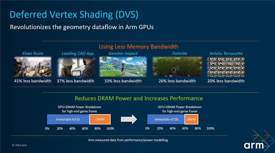 Immortalis G720采用了延迟顶点着色延迟顶点着色(Deferred Vertex Shading, DVS),ARM官方表示,它能减少对内存和带宽资源的占用,能将带宽使用降低40%。根据ARM的实测,得益于DVS技术,Immortalis G720实际性能提升20%。