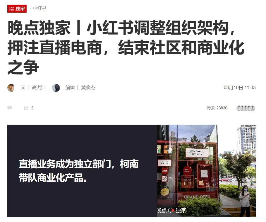 据悉,今年3月小红书提升直播业务为独立部门,统一管理直播内容与直播电商等业务,押注直播电商。而小红书之前的组织架构,先是电商部门独立、吸引商家入驻,再变为电商部门并入社区部门,最后变成如今的格局。