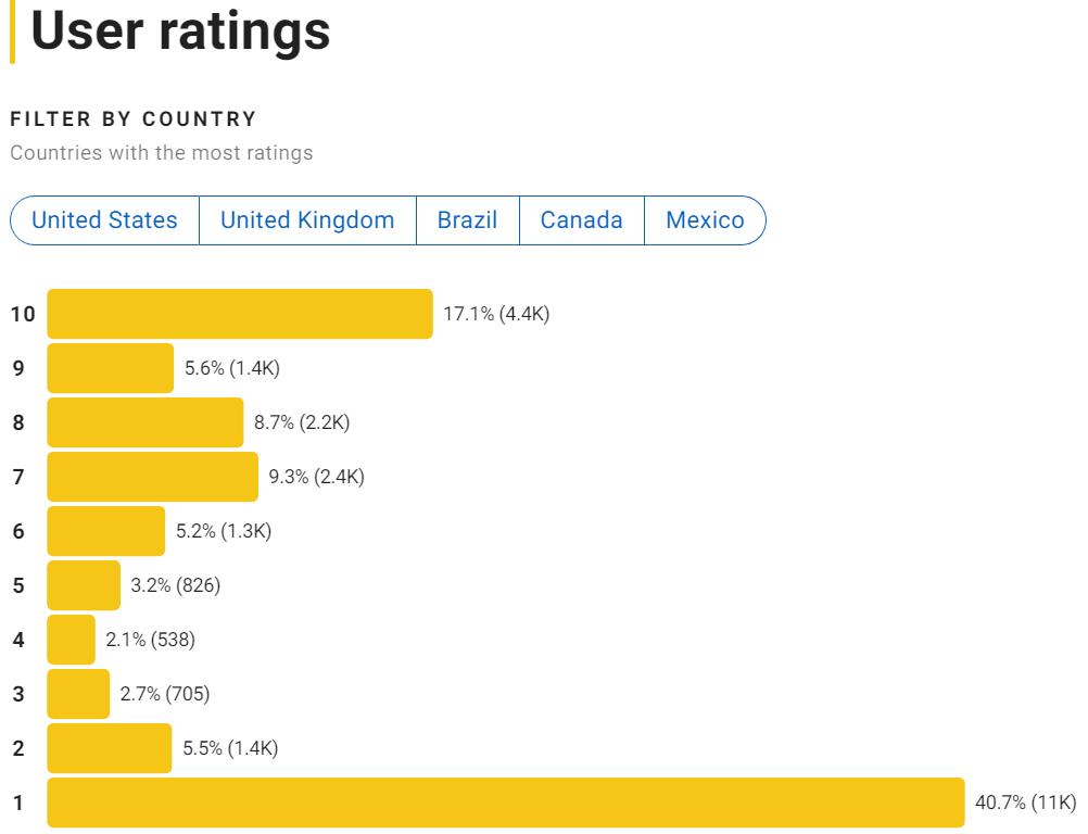 但国外网友们照样争吵得非常厉害,目前IMDb开分7.0,但IMDb页面已经出现疑似“锁分”的现象,用户评分占比显示有40.7%的用户打出了1分的最低分,但也有17.2%的用户打出满分,北美观众分歧导致的舆论魔法大战甚嚣尘上。