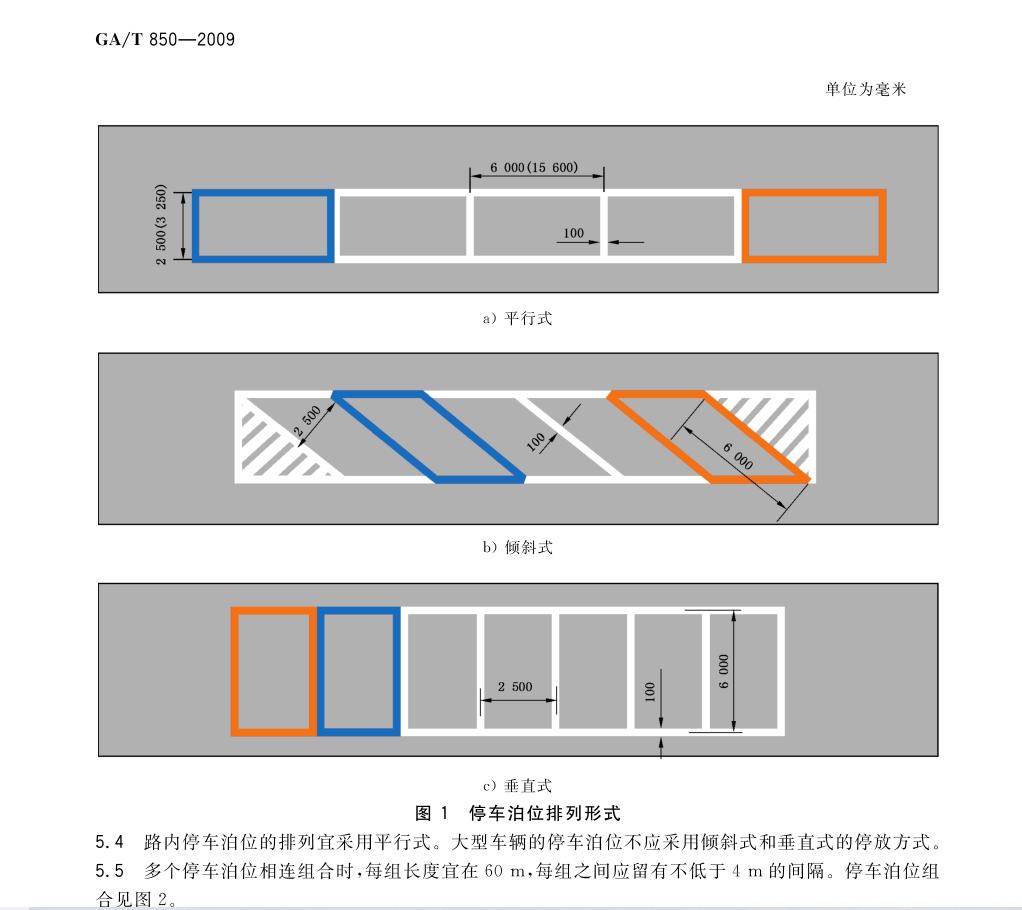 停车位排列方式可以分为三种:平行式、倾斜式(倾角30°、45°、60°)和垂直式,大型车辆停车位不应采用倾斜式和垂直式。