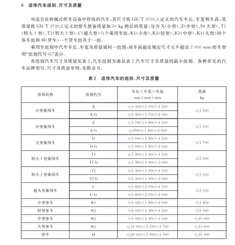 另一方面,我们经常见到的机械式立体停车库,也有相应的尺寸标准。根据国家标准GB/T 26559-2021中发布的内容,对适合在机械式停车设备中停放的汽车,其尺寸按GB/T 3730.3定义的汽车车长、车宽和车高,其质量按GB/T 3730.2定义的整车整备质量加50kg物品的质量,分为六个乘用车组和四个客车组以及一个货车组共十一组。