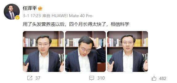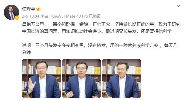 2月5日,任泽平发微博称,“三个月头发变多变粗变黑,没有植发,用的一种营养液科学方案。”