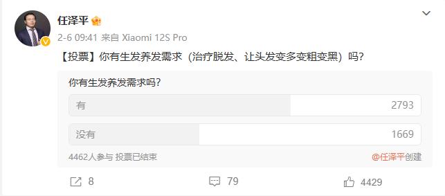2月6日,任泽平在其微博发起投票“你有生发养发需求吗?”截至目前已经有4462人参与投票。