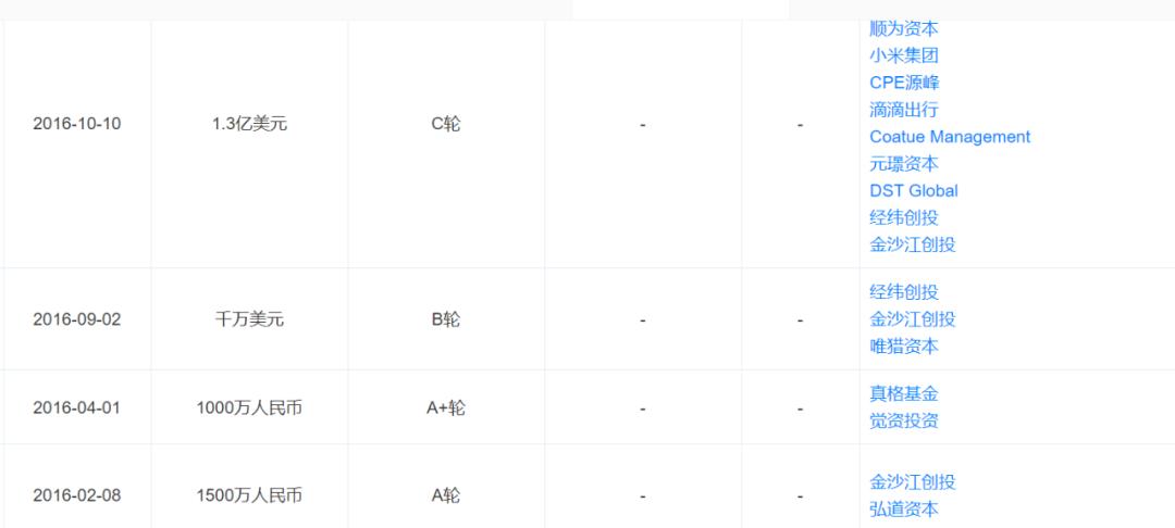 天眼查显示,2016年2月至10月,ofo完成了A轮、A+轮、B轮以及C轮募资,参与资本包括小米集团、滴滴出行、经纬创投等。其中,光是2016年的募资就接近2亿元人民币。