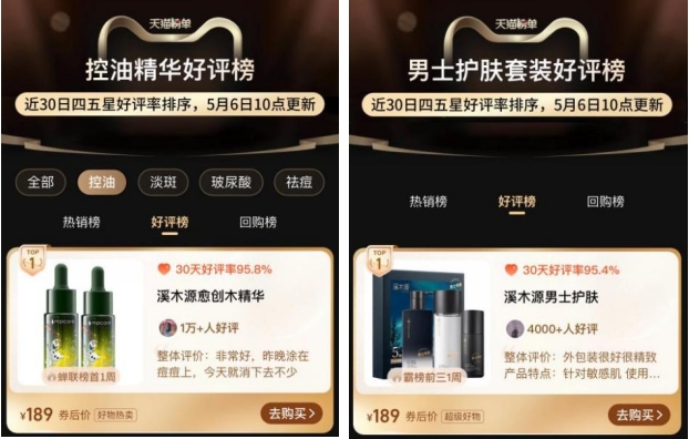 愈创木祛痘精华登上天猫控油精华好评榜第一、极光黑云杉男士护肤系列登上天猫男士护肤套装好评榜第一