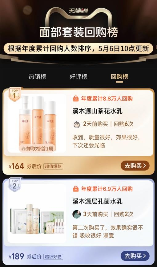 溪木源山茶花水乳、层孔菌水乳在天猫的面部套装年度回购榜单中包揽前二