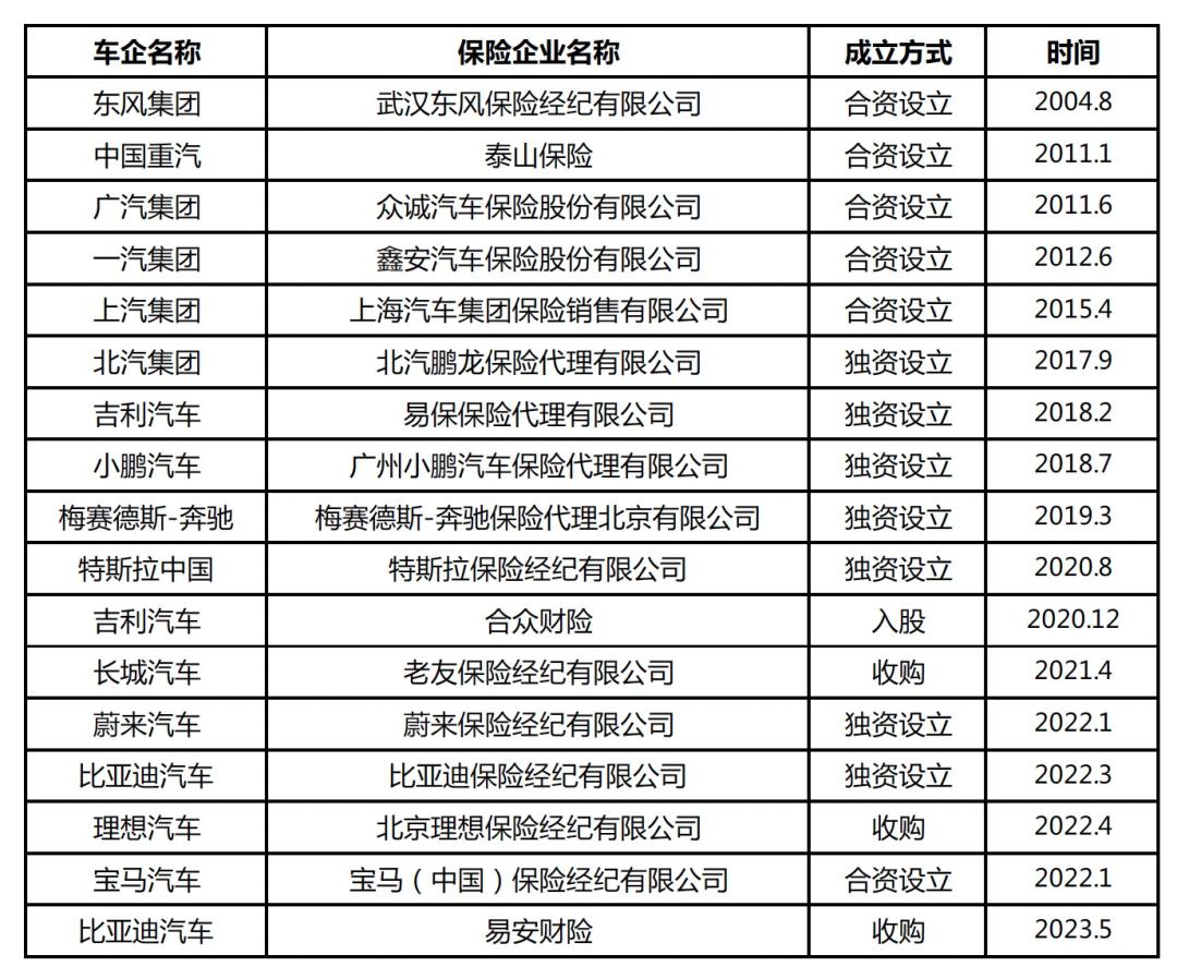 车企布局保险业务情况统计(数据来源:课题组根据公开资料整理)