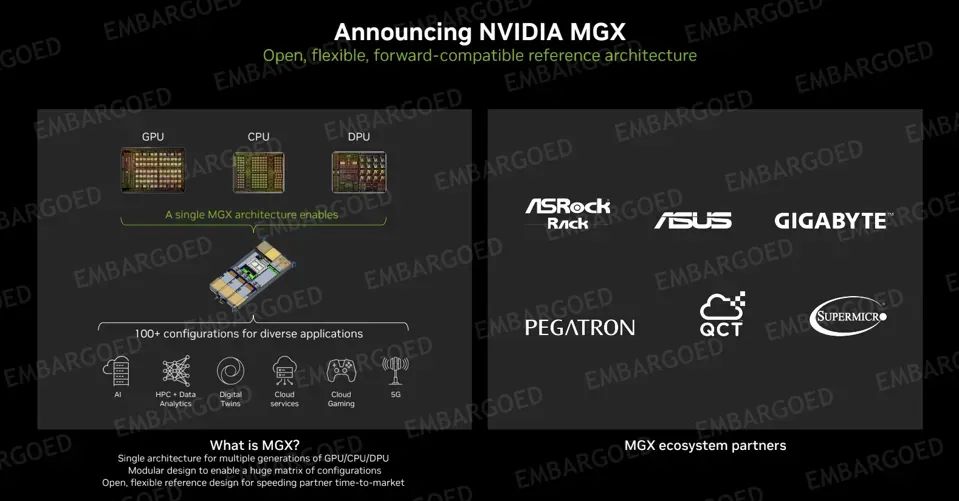 全新的NVIDIA MGX是一种参考架构,为系统OEM合作伙伴标准化了多代CPU, GPU和DPU的单一架构。图片来源:英伟达