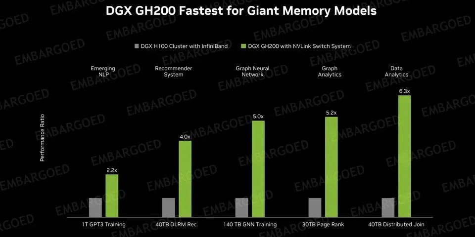 采用NVLInk连接的DGX GH200集群的AI性能是采用InfiniBand的H100集群的2-6倍。图片来源:英伟达