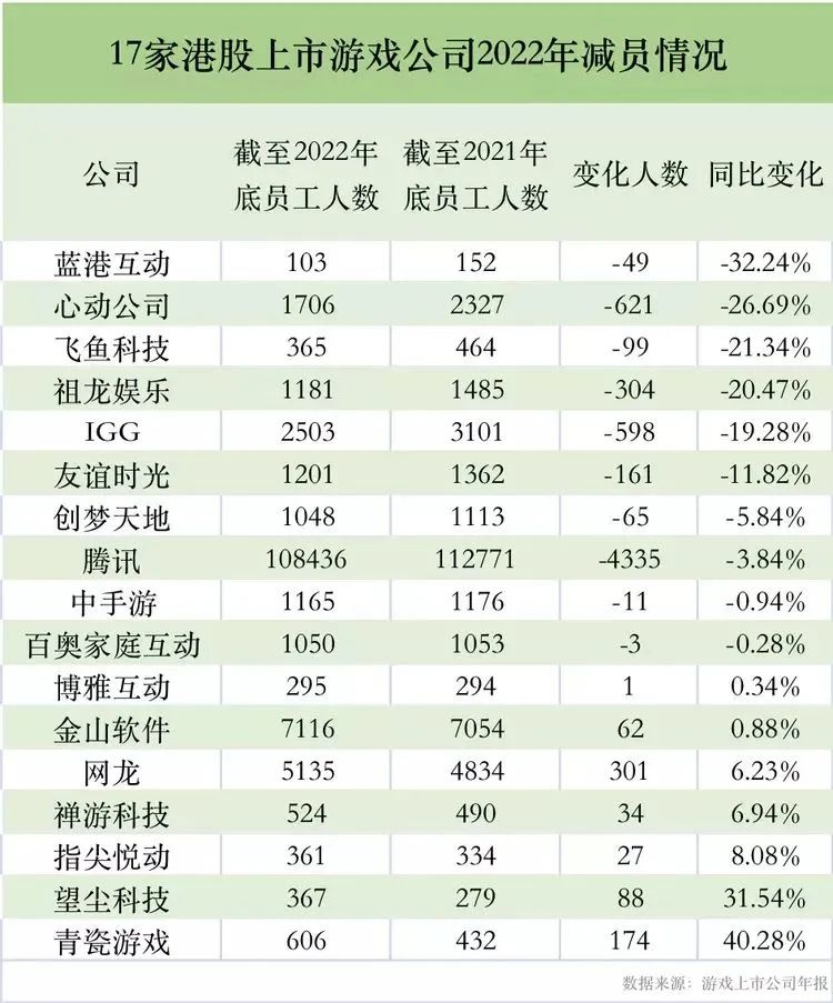郝佳通过实习阶段的同事了解到,有新员工入职便遭遇了项目裁撤,实际上,这不只是个别公司才有的问题。根据财经媒体的统计,17家披露2022年员工人数变化的港股游戏上市公司中,有10家游戏公司减员,其中减员超过10%的有6家。“降本增效”是大公司们在上一年度财报中的关键词。