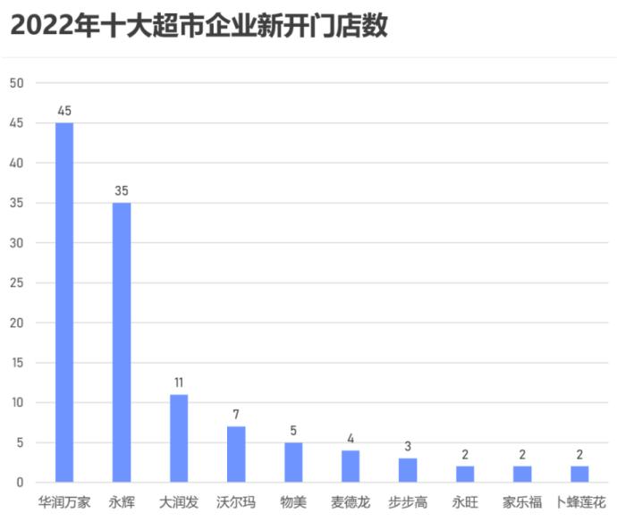 《2022超市业态调查快报》显示,调研的70家样本超市企业2022年关店接近900家。据赢商网统计,2022年全年十大传统超市企业新开门店数为100余家,是近五年来最低水平。