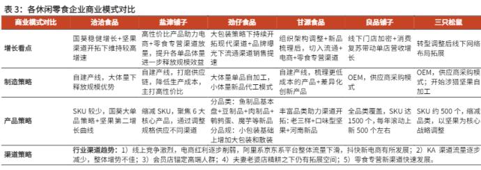 洽洽、劲仔这类sku较少、以大单品为战略(洽洽2021年营收中国葵和坚果两大品类分别贡献66%、23%,劲仔以鱼类零食为主,2022年鱼制品单品体量已达10亿),以流通渠道作为基本盘(截至2022年末,洽洽的传统、现代、特通渠道营收占比分别为4:4:2。劲仔的流通渠道占比70%)更看重稳价,合作相对谨慎;