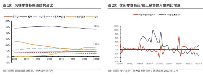 据欧睿数据,受益于互联网流量红利,休闲零食的电商渠道份额自2012年后逐年递增,2022年占比达到15.8%,仅次于超市渠道,但近年来电商渠道增速已不断放缓,线下渠道仍然是休闲零食的主导销售渠道,故此不再赘述线上渠道。