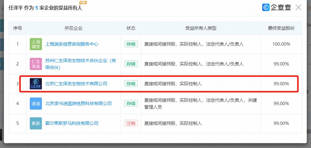 任泽平如此大力带货,并不令人意外。企查查数据显示,“仁生泽发”关联3家公司:北京仁生泽发生物技术有限公司、苏州仁生泽发生物技术合伙企业、苏州仁生泽发生物科技有限公司。其中,北京仁生泽发最终受益人为任泽平,苏州仁生泽发生物技术合伙企业的执行事务合伙人为任泽平,苏州仁生泽发生物科技有限公司的股东也有任泽平。
