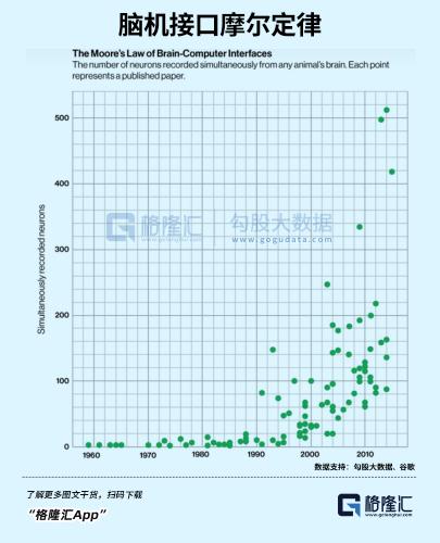 下图是脑机接口摩尔定律表,展现的是计算机记录大脑神经元数量的速度,平均7.4年才能使可同时记录的神经元数量翻倍。