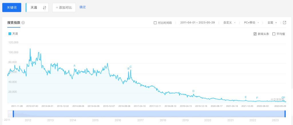 天涯已经消失在公众视野许久。在百度指数上搜索“天涯”,可以看到,在2011年4月29日到2023年5月29日这12年中,天涯的搜索指数明显下滑。在2019年之后,其搜索指数再也没能超过20000。