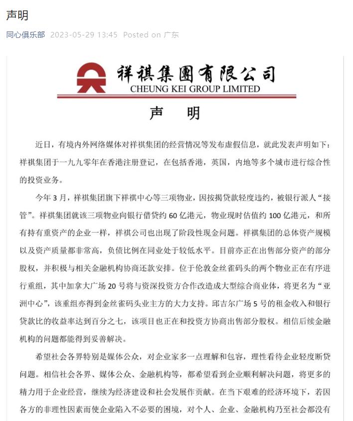 事实上,早在今年三月底,陈红天就通过同心俱乐部发布了香港物业被接管的消息。彼时,祥祺集团将资金问题解释为,近期多笔大额应收账款被对方临时悔约,且又一笔大宗交易买家临时毁约造成关联违约等。不过,当时祥祺集团称“这些问题相信在短时间内可以妥善解决”。