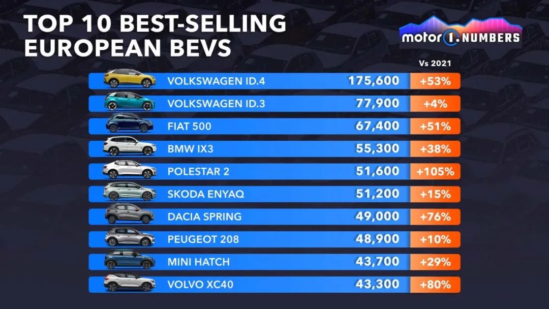 客观方面,受制于制造成本与技术,欧洲本土的纯电新车售价普遍偏高,且续航较短, 2022 年,仅有大众 ID.4 年销破 10 万辆大关,其余均在 5 、 6 万辆左右。