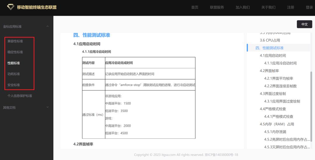 而且如果你仔细对比,会发现它的金标认证标准跟绿色应用认证标准大差不差,两者都是从稳定性、性能、功耗还有安全等方面对 App 进行的测试。