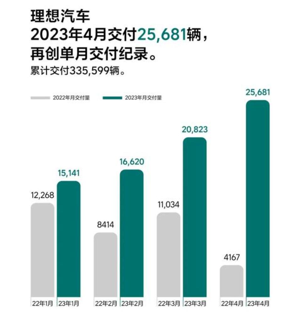 根据理想汽车此前公布的交付数据,4月共交付新车25681辆,再创单月交付新纪录,同比增长516.3%。这是理想汽车连续第二月交付量破2万辆,这个成绩在蔚小理中处于遥遥领先的状态。