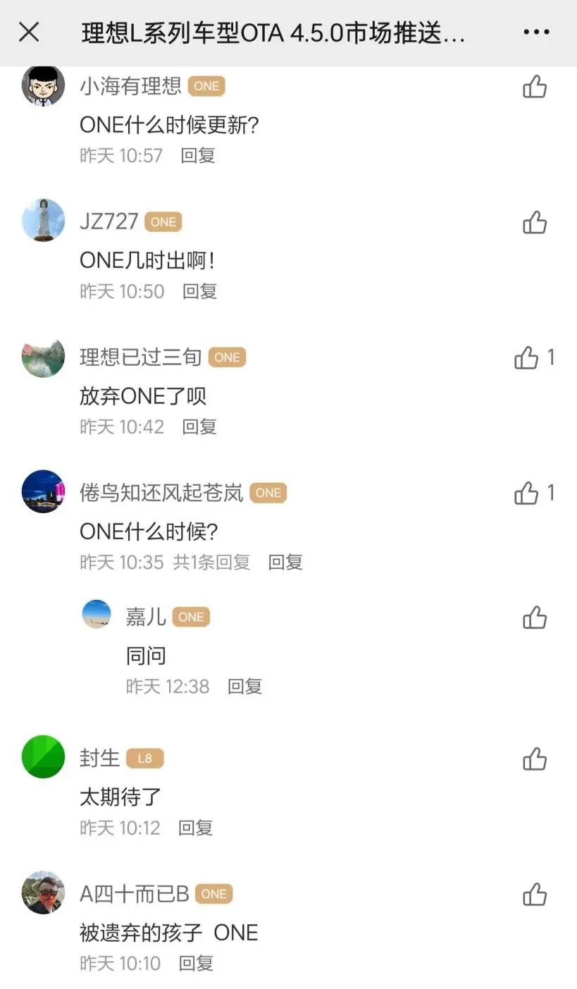 不过,在这几个车型的车主们喜迎更新的同时,理想ONE老车主们却纷纷表达不满:“没有理想ONE?”,“理想ONE什么时候更新?”,“我们20万理想ONE车主成了永远的韭菜”。