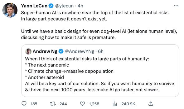 Yann LeCun就在Twitter上表达了对这一担忧的反对,他表示,超人AI完全不在人类灭绝危机的名单前面——主要因为它现在还不存在。“在我们可以设计出狗这个级别的AI(更不用说人类级别的AI了)之前,讨论如何让它更安全完全为时过早。”