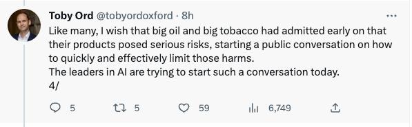 许多专家指出,大型语言模型等系统的迅速改进是可以预见的。一旦人工智能系统达到一定的复杂程度,人类就可能无法控制它们的行为。来自牛津大学的学者Toby Ord就表示,正如人们希望大烟草公司能够早一点承认他们的产品会带来严重的健康危害、并开始讨论怎么限制这些危害一样,现在AI的领袖们正在这么做。