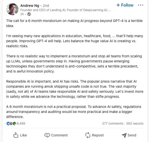 人工智能领域的著名学者、Landing AI的创始人吴恩达当时也在LinkedIn上发文表示,认为全面暂停AI训练6个月的想法是一个糟糕、不切实际的想法。