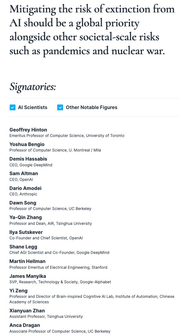 完整签名名单,可以在这里进行查看:https://www.safe.ai/statement-on-ai-risk#open-letter