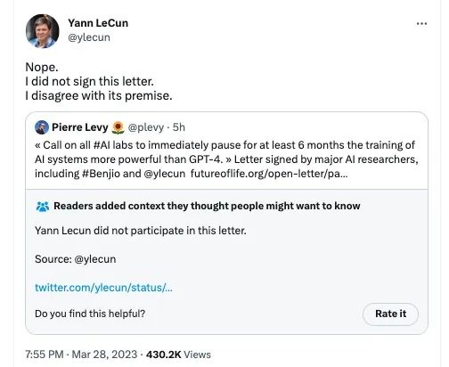 比如当年跟Yoshua Bengio一起获得图灵奖,人工智能“三巨头”之一的Yann LeCun当时就明确表示他并不同意这封信的观点,也没有签名。