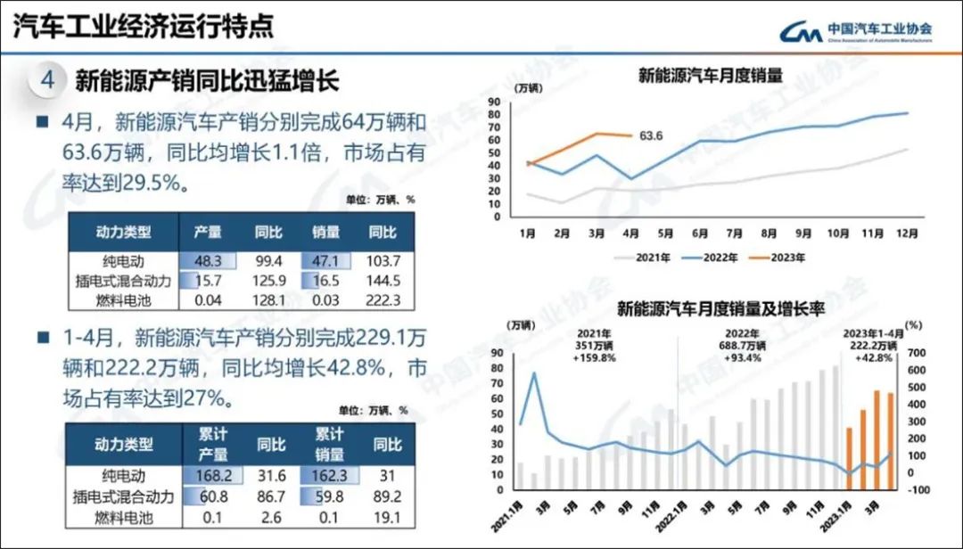 另一方面,据中汽协数据显示,4月,新能源汽车产销分别完成64万辆和63.6万辆,同比均实现大幅增长,市场占有率达到29.5%;1-4月,新能源汽车产销分别完成229.1万辆和222.2万辆,同比均增长 42.8%,市场占有率达到 27%。