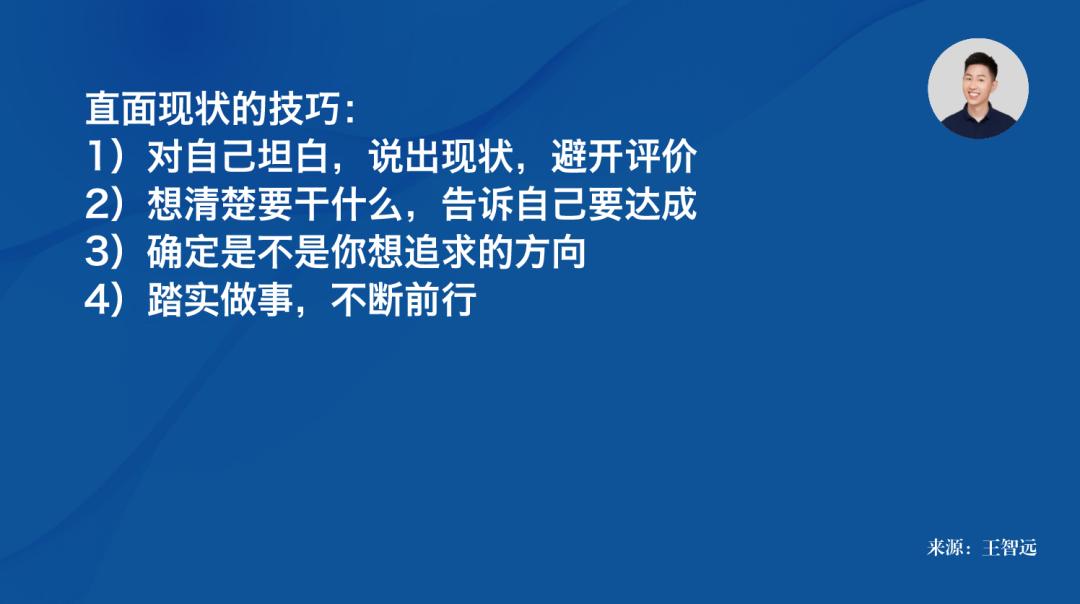 一.对自己坦白,说出现状,避开评价;二,想清楚你要干什么,明确目标,告诉自己,我要达成;三.确定是否愿意做,是不是你想追求的方向;四,踏实做事,不断前行。