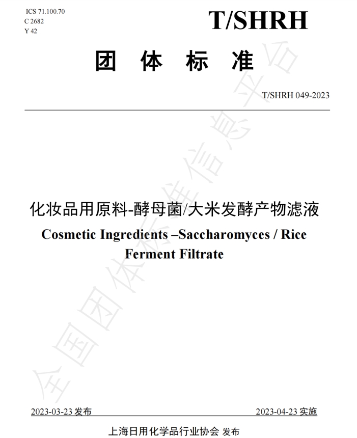 制订过程历经一年时间,于2023年3月23日发布。标准名称中文为《化妆品用原料-酵母菌/大米发酵产物滤液》,名称英文为《Cosmetic Ingredients -Saccharomyces / RiceFerment Filtrate》,标准文号为:T/SHRH 049-2023。