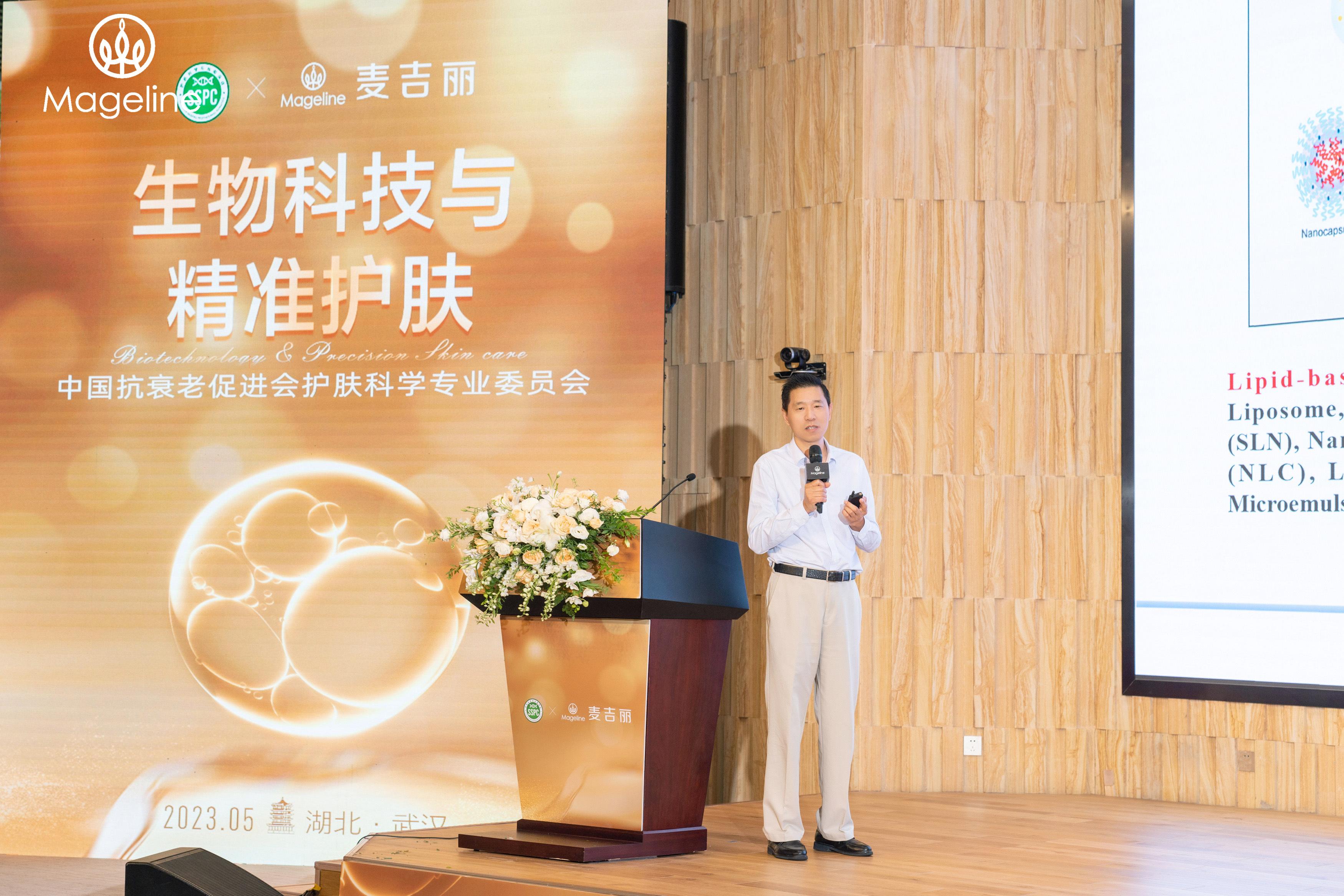 华中科技大学生命科学技术学院刘卫教授分享了《经皮药物输送技术在功效化妆品中的应用》主题演讲