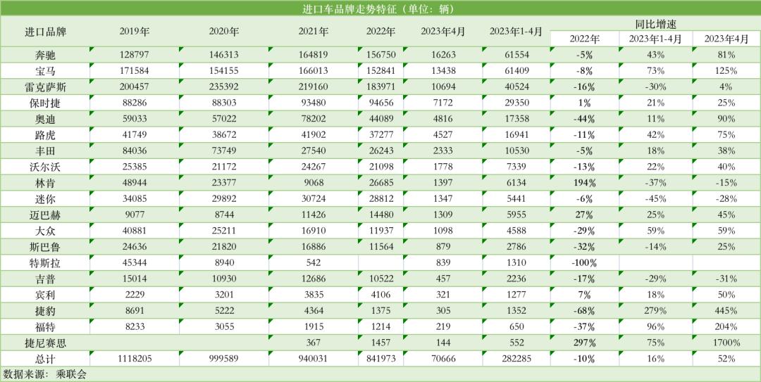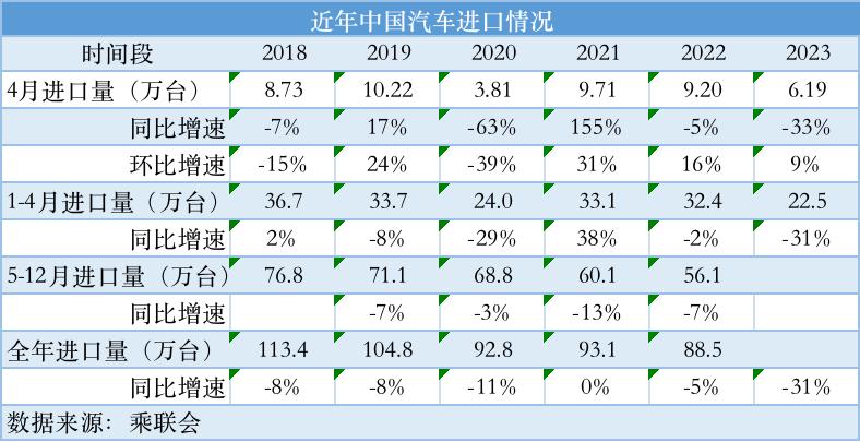 进口车市场正在整体降温。乘用车市场信息联席会秘书长崔东树发布的数据显示,2023年4月,汽车进口量6.19万台,同比下降33%。